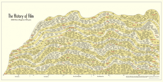 Het levert een bijna organische visualisatie op, al die films verspreidt over een timeline. Toch kwam niet elke film in Gormley’s design terecht: “Films selected to be included have: won important awards such as the best picture Academy Award; achieved critical acclaim according to recognized film critics; are considered to be key genre films by experts; and/or attained box office success.”