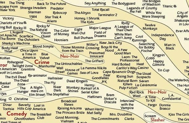 Toegegeven, mijn smaak is het qua design niet helemaal. Maar een indrukwekkend staaltje informatie vergaren en visualiseren is het wel, de poster van designer Larry Gormley. Zijn werk bevat van meer dan 20 filmgenres van de afgelopen 100 jaar, een dikke 2000 films dus!