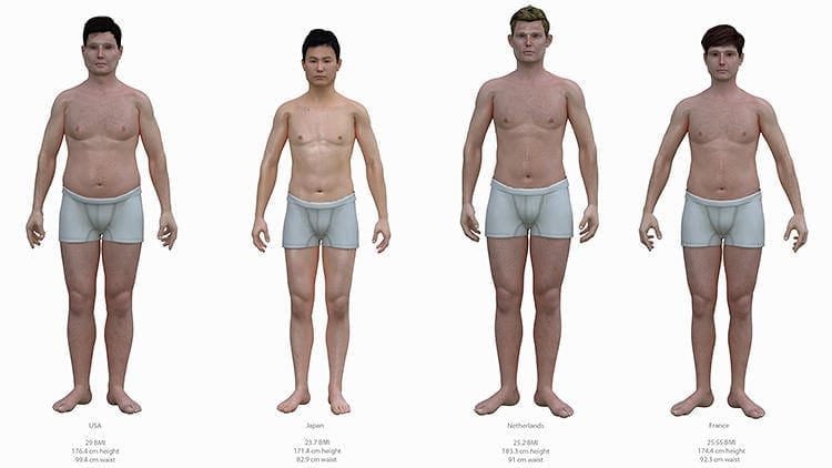 Van links naar rechts: de gemiddelde Nederlander, Amerikaan, Fransman en Japanner.