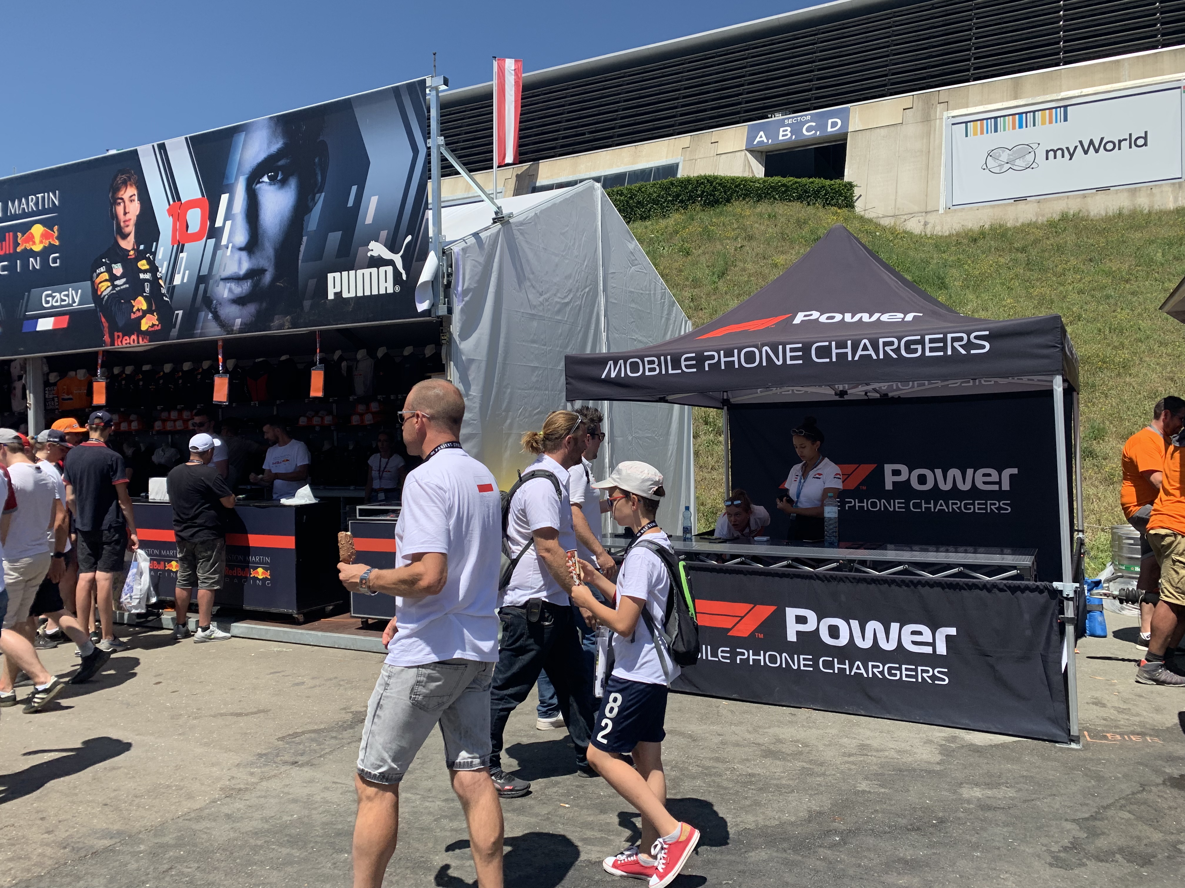 In de verschillende fan-zones achter de tribunes waren F1-merchandise, eten en drinken maar ook battery-packs te krijgen