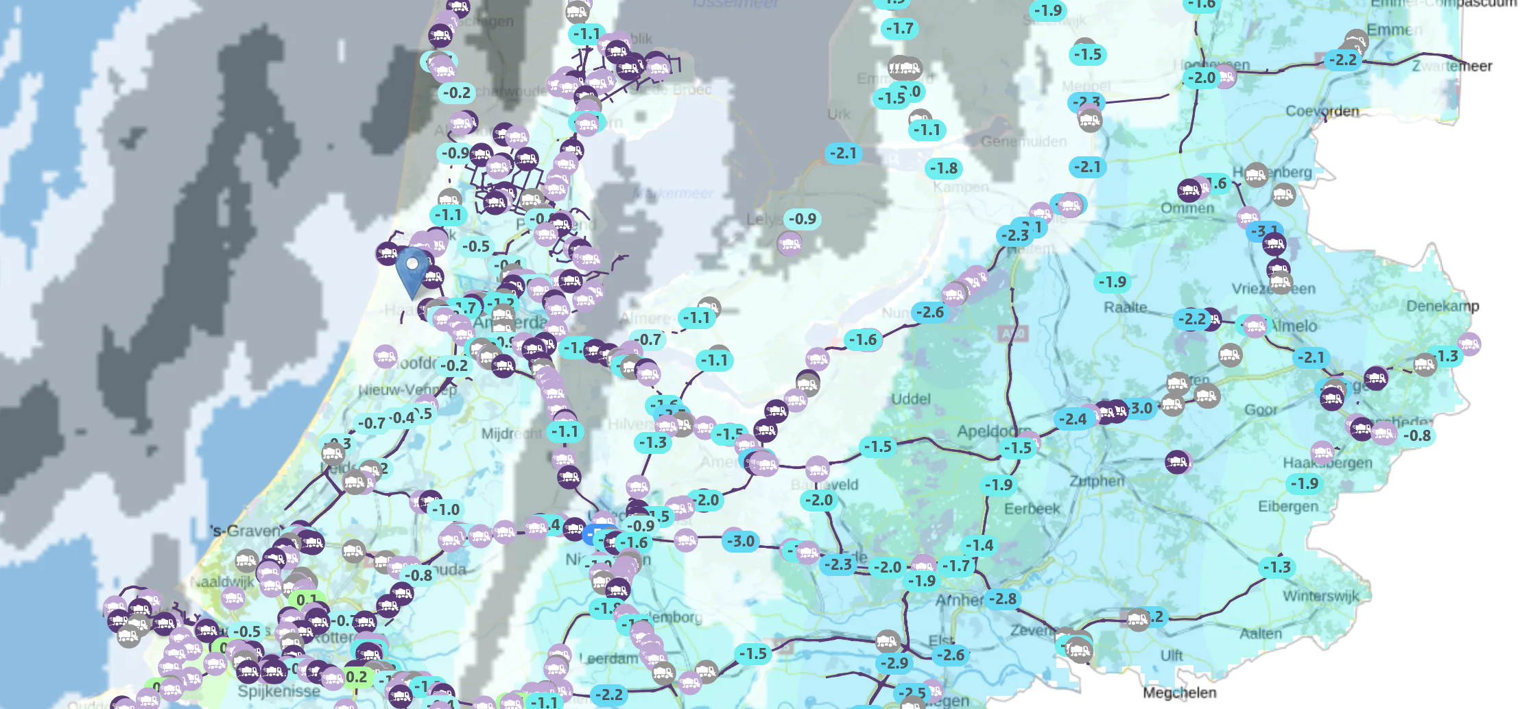 De kaart laat onder andere zien waar strooiwagens actief zijn en welke wegen ze al hebben behandeld. Daarnaast zie je ook de temperatuur van het wegdek op verschillende locaties, via sensoren verspreid over het land.
