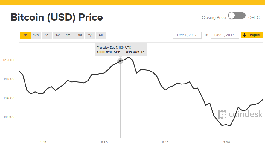 De waarde van Bitcoin is flink aan het stijgen. Op 28 november, negen dagen geleden, tikte de prijs voor het eerst 10.000 dollar aan. Ongeveer één uur geleden (12.34 uur Nederlandse tijd) bereikte de digitale munt volgens de prijsindex van CoinDesk een waarde van 15.000 dollar.