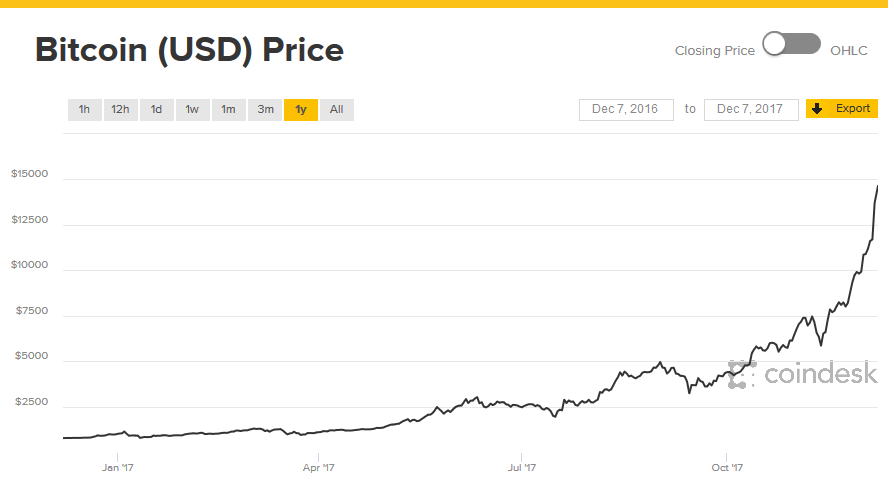 In de Bitcoin-grafiek van CoinDesk over het afgelopen jaar is te zien hoe sterk de waarde van de digitale munt het afgelopen jaar is gestegen. In december 2016 was één Bitcoin nog geen 800 dollar waard. Vanaf het voorjaar begint de munt al aan zijn waardestijging, om de laatste weken helemaal uit de pan te vliegen.
