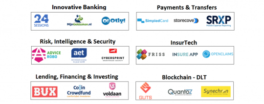 Prijzen waren er ook nog voor SRXP (Payments & Transfers) en Cybersprint (Risk, Intelligence & Security). Rabobank werd door de jury verkozen tot meest innovatieve bank van dit moment. Het publiek heeft voor aanvang ook mogen stemmen op de 50 geshortliste deelnemers aan het event. Door hen werden Finaps (Innovative Banking), Synechron (Blockchain), Collin Crowdfund (Lending, Financing & Investing), Dimebox (Payments & Transfers), NgCompliance (Risk, Intelligence & Security), Fixico (InsurTech) en Rabobank (Incumbent Banks) uitgeroepen tot publieksfavorieten.