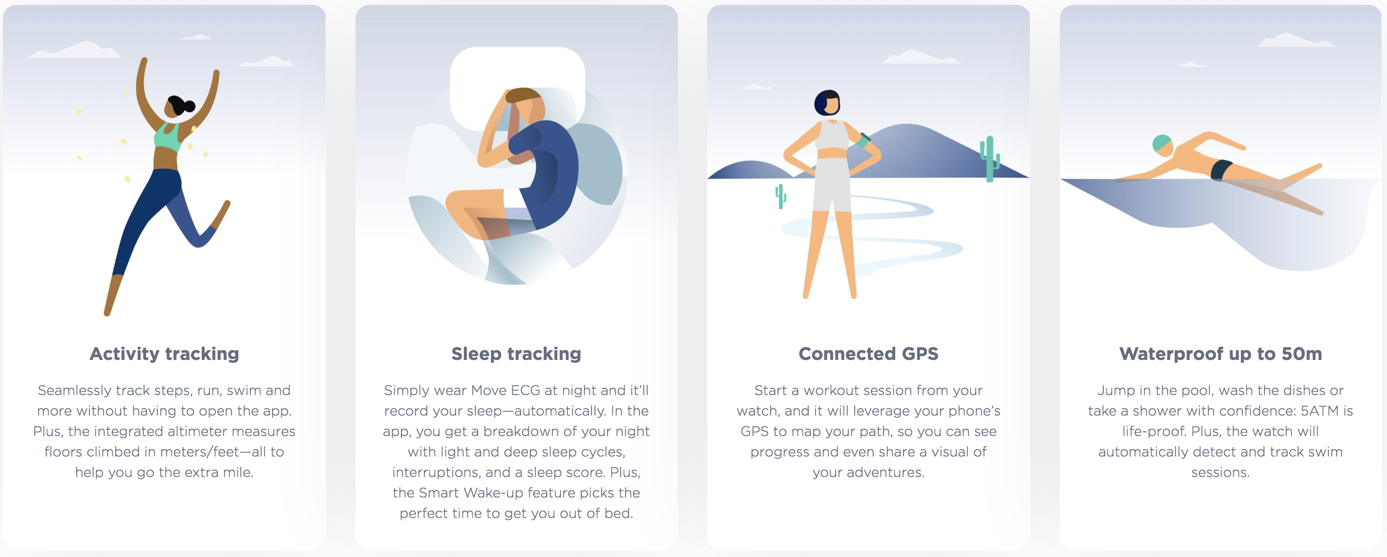 Ook de instapprijs is alleszins aantrekkelijker dan die van duurdere concurrenten zoals Apple of Samsung: voor €129 heb je een horloge dat niet alleen overal een ECG van je hartslag kan maken, maar deze data ook kan delen in een medisch dossier met je dokter of een familielid. Daarnaast heeft de Move ECG een GPS functie zodat de locatie van een persoon trackable is. Er zit een stappenteller op die je motiveert om meer te bewegen. Lelijk is dit horloge van Withings geenszins.