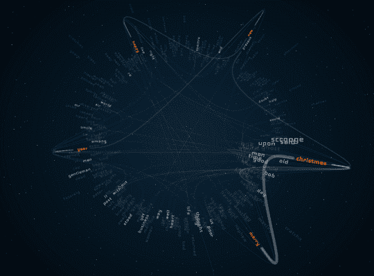 Wat stuur je relaties met de kerst als je data visualisator van beroep bent? Een datavisualisatie van een wereldberoemd kerstverhaal natuurlijk. Jan Willem Tulp van Tulp Interactive filterde alle twee-woord sequenties uit het bekende boek ‘A Christmas Carol’ van Charles Dickens en plaatste deze op een interactieve kaart die precies weergeeft wat de relatie tussen deze onderlinge bigrammen is. Vaak voorkomende lid- en stopwoorden werden uit de resultaten gefilterd om een zo betekenisvolle visualisatie neer te zetten.