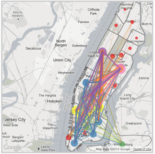 Voor deze uitdaging analyseerde Voytek de start- en eindpunten van de verschillende ritten die Uber deed in Amerikaanse steden als LA, Seattle en New York. Voytek: “Well we can identify networks of “related” neighborhoods and find the neighborhoods that are the “hub” of the city, into and out of which the most people flow.“. En hoewel dat sowieso leuk is om te zien, heeft het onderzoek nog een andere opvallende conclusie.