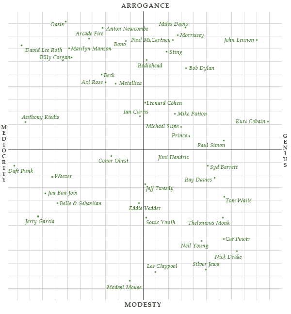 artist_plotEen goede muzikant is een combinatie van talent en karakter. Althans, dat stelt Jimmy Chen bij zijn data visualisaties van diverse artiesten uit allerhande genres. Maar waar wat is de gouden combinatie, waar trekken fans de grens en waarom is het toch voor elke artiest zoveel anders?