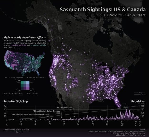 squatch-watch-92-years-of-bigfoot-sightings-in-the-us-and-canada_5238386654cceBig Foot, Yeti’s, De Verschrikkelijke Sneeuwman: allemaal termen voor een dier waar al honderen jaren over gediscussieerd wordt of deze nu bestaat of niet. In ieder geval wordt het dier regelmatig ‘gezien’. Josh Stevens, student van Penn State, verzamelde alle data van deze waarnemingen en verwerkte deze in een data visualisatie.