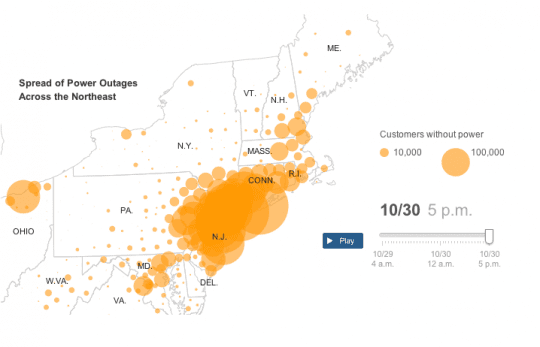 De pagina is opgedeeld in 7 hoofdstukken, van schade aan het openbaar vervoer tot de effecten van wind, water en vuur. Maar het meest in het oog springende is toch de interactieve visualisatie van de stroomuitval langs de oostkust van de VS. In een hele korte tijd raakte meer dan 6 miljoen huishouden afgesloten, waarbij er totaal minstens 17 staten werden getroffen door storingen.