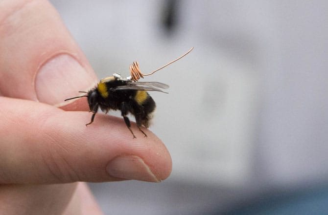 De kleine trackers zijn ongeveer acht millimeter hoog en 4,8 millimeter breed en worden met behulp van secondelijm op de rug van de bijen gemonteerd. Volgens de ecologen ondervonden de bijen geen hinder van de tracker tijdens het vliegen en kunnen de trackers een ‘bijenleven’ lang mee.
