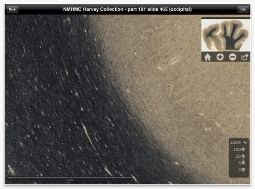 Dat voorrecht geniet nu iedere eigenaar van een iPad. In de afgelopen jaren is er veel tijd en geld geinvesteerd om de plaatjes te digitaliseren en op die manier “langere tijd” op te rekken naar “zo’n beetje eeuwig”. Met “Einstein Brain Atlas for iPad” is het nu mogelijk om een deel van die gedigitaliseerde plaatjes te bekijken en is de verwachting dat de komende periode meer van de oude plaatjes beschikbaar zullen worden gesteld. De app is tamelijk kostbaar, maar een deel van de $9.99 die de app kost komt ten goede aan het museum van gezondheid en medicatie, NMHMC in Silver Spring, USA.
