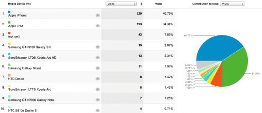 Opvallend is dat 42% van onze bezoekers Chrome gebruikt om de site te bezoeken, dat daarmee veruit de meest populaire browser is, gevolgt door Safari Web (19%), Safari App (14%), Firefox (10%), Internet Explorer (8%) en Android Browser (5%). Aan de browserverdeling valt al op te maken dat de site populair is onder mobiele gebruikers, en dat klopt: 30% van alle bezoek op Numrush.nl komt vanaf een mobile device. De iPhone (41%) is onder mobiele gebruikers veruit het populairste, op de voet gevolgd door de iPad (34%). Daarna volgt een longtail van diverse Android toestellen waarbij Samsung Galaxy II, Sony Ericsson Xperia Arc, Galaxy Nexus, HTC Desire en Galaxy Note de meest gebruikte zijn.