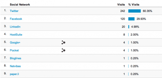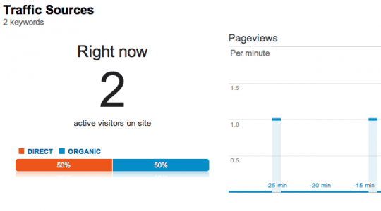 Ten slotte hebben we natuurlijk gekeken naar de belangrijkste trafficbronnen. Direct verkeer naar Numrush.nl is met 38% de grootste bron op dit moment, gevolgd door Twitter (19%), het artikel op Dutchcowboys (9%), RSS feeds (8%), het artikel op Lifehacking (8%), Facebook (7%), Google Search (4%) en Linkedin (1%).