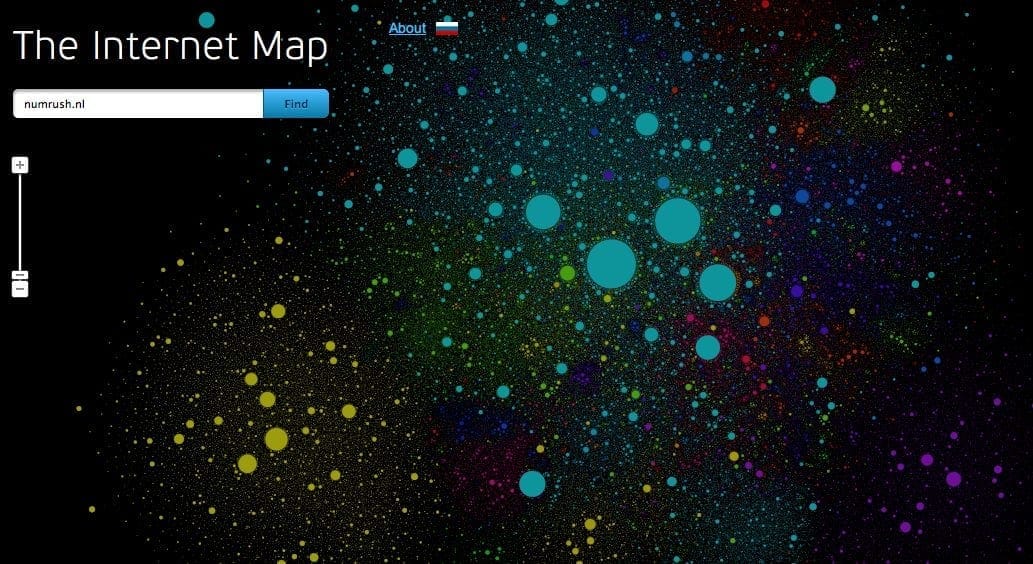 Ook zo benieuwd hoe het internet eruit zou zien als het in een ouderwetse atlas zou staan? Dat zou er dan ongeveer uitzien zoals in onderstaande graffic. Daarin zijn namelijk de 350,000 grootste websites (volgens Alexa ranking) op het internet verwerkt in een soort digitaal sterrenstelsel. De kleuren geven aan uit welk land de site komt (lichtblauw staat voor de VS, rood voor Nederland, etc). Uiteraard zijn de grotere planeten sites als Google, Facebook, etc.