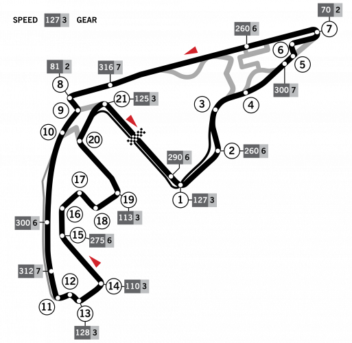 Het eerste deel van de baan is inderdaad snel. Bocht 2 en 4 worden genomen met 250 en 270 kilometer per uur. Dan is het flink remmen in het arenagedeelte rondom de hairpin, die met 75 per uur genomen wordt. Daarna volgt de tweede sector, met twee lange rechte stukken. Even voluit gassen en dan boven op de rem voor bocht 8: van 335 terug naar 80 per uur.