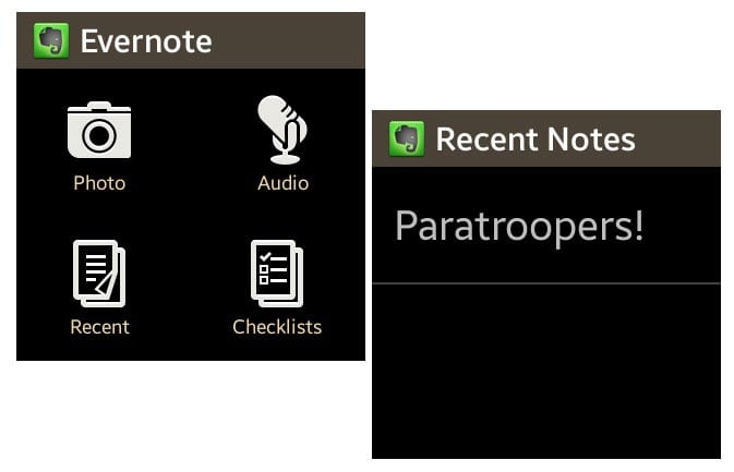 Ik ben een fanatiek gebruiker van Evernote, hetgeen er voor zorgt dat ik meerdere keren per dag even mijn telefoon te voorschijn haal om een foto te maken van iets dat ik niet moet vergeten of later nog moet terugvinden. Dankzij de Gear kan dit nu een stuk vlotter en zelfs zonder smartphone: een dubbele druk op de knop en Evernote opent de camera functie. Even bijdraaien en een tik op het scherm en de notitie staat in Evernote.