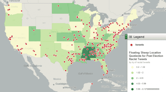 De wetenschappers van Floating Sheep begonnen zich af te vragen hoe deze reacties zich verhielden binnen de grenzen van de Verenigde Staten: “So, are these tweets relatively evenly distributed? Or do some states have higher specializations in racist tweets?” In onderstaande kaart zien we het antwoord, waarbij individuele tweets middels rode stipjes zijn gevisualiseerd. De geel gekleurde staten hebben over het algemeen minder haatdragende tweets n.a.v. de verkiezingen, waar de groene staten een opvallend hoger aantal lieten ontvallen.