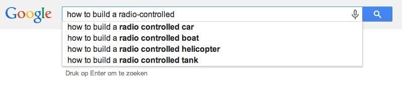 Een bizar verhaal natuurlijk, maar wat ik me maar blijf afvragen: hoezo kwam die autocomplete überhaupt tot stand? Zoals gezegd: algoritmes liegen niet en wie zoekt op “how to build a radio-controlled”…. of zou Google de autosuggest intussen al filteren?! <insert mystery tune>.