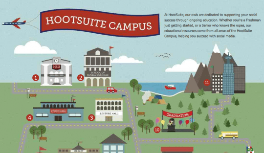Omdat Hootsuite een vrij geavanceerde analysetool is, heeft het bedrijf een serie webinars gemaakt waarin het gebruik van de dienst tot in de puntjes wordt uitgelegd. Tot voor kort waren die video’s niet meer dan een lijst op de website, maar gisteren lanceerde Hootsuite een zogenaamde ‘Infomapic‘, waarin de cursist op een haast Levensachtige wijze de ‘Hootsuite University‘ kan doorlopen. Zo beginnen ‘studenten’ in de collegezaal en bezoeken ze achtereenvolgend de bibliotheek, mensa, decaan, pub voordat ze uiteindelijk glansrijk afstuderen.