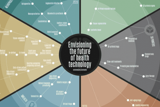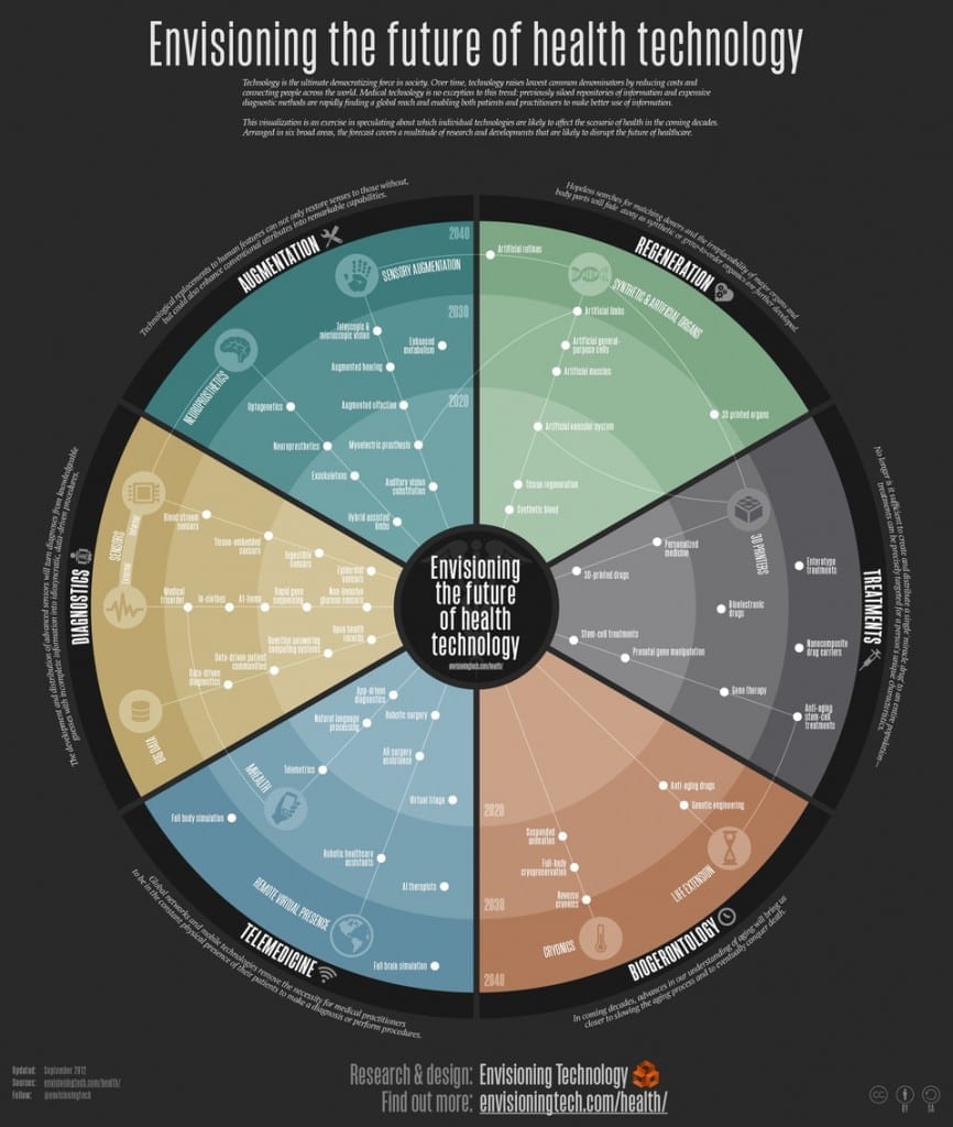 Niemand weet precies hoe de toekomst er uit zal gaan zien, maar als het binnen één vakgebied interessant is om die ontwikkelingen te volgen is het wel de gezondheidszorg. Worden we straks allemaal 140? Kunnen we organen vervangen met kunstmatige varianten? En zorgt een pilletje ervoor dat ons haar niet meer grijs wordt of we makkelijker afvallen? Al die scenario’s zijn denkbaar, als we de medische futurologen mogen geloven. In onderstaande infographic van Envisioning Technology wordt een helder overzicht gegeven van alle ontwikkelingen die die innovatie mogelijk maken, en waar we de komende jaren op mogen gaan rekenen. Een paar trends op een rijtje: