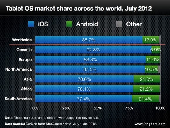 De cijfers spreken boekdelen: wereldwijd komt meer dan 85% van alle traffic op het wereldwijde web van iOS-tables (ofwel: iPads) terwijl 13% voor Google’s Android gereserveerd is. Onder “Other” vinden we Blackberry’s Playbook terug, samen met WebOS en Windows/Linux tablets. Als we kijken per continent zien we wel wat verschillen.