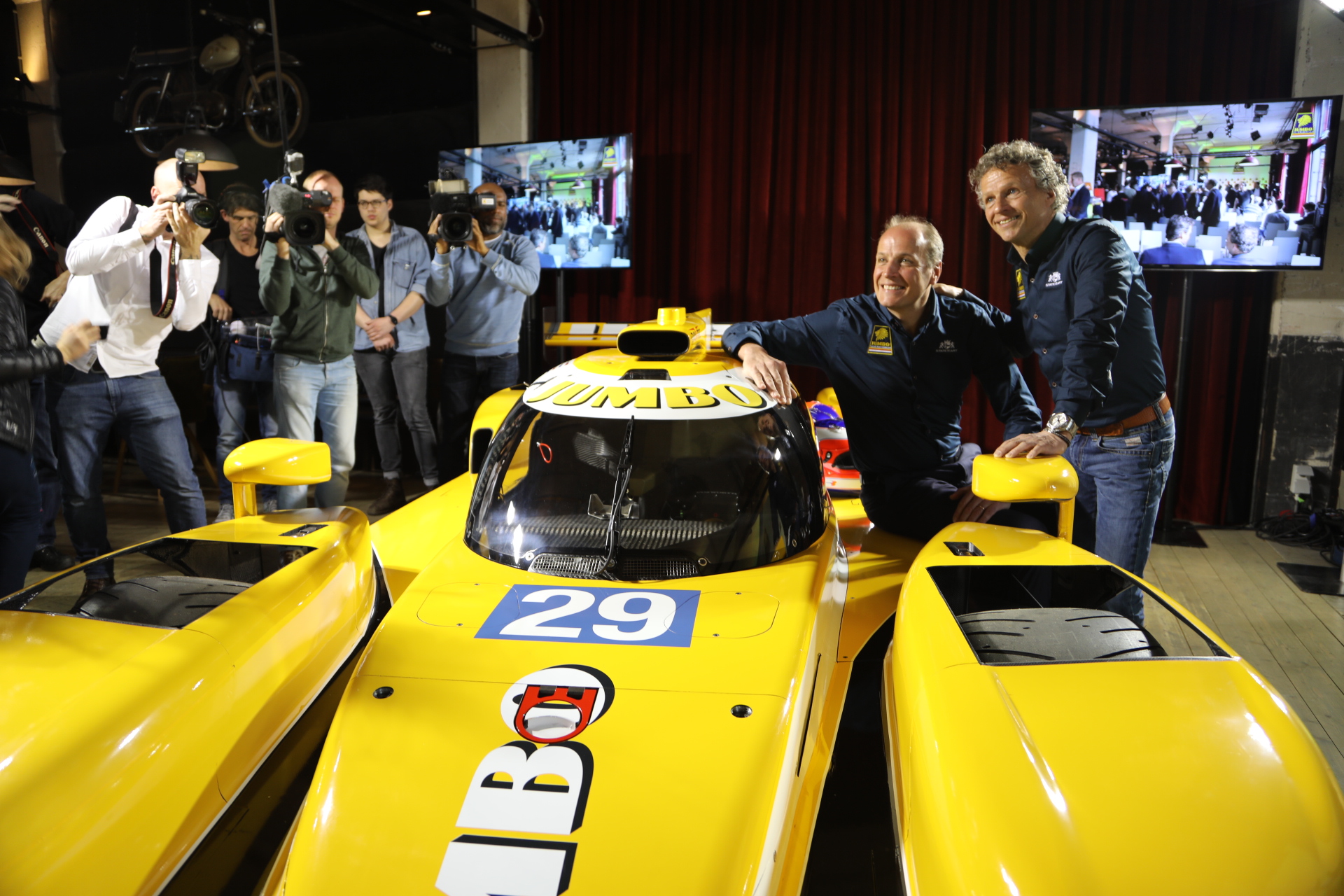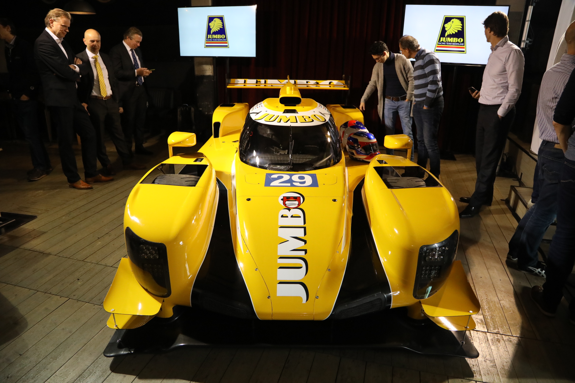 Vandaag werd de opvallende wagen onthuld in het Brabantse Veghel, vlakbij het distributiecentrum en de Foodmarkt van Jumbo. In de zaal zitten zo te horen naast pers ook veel collega’s van het hoofdkantoor. Directeur Frits van Eerd heeft weliswaar de nodige race-ervaring, het is voor hem de eerste keer dat hij deel gaat nemen aan de zware beproeving van Le Mans: In 24 uur tijd wordt een circuit van 13,6 km afgelegd door de drie teamgenoten die elkaar afwisselen. In totaal wordt een raceafstand van bijna 5000 km afgelegd, of zoals Jan Lammers zich laat ontvallen: “Bijna een compleet Formule 1 seizoen in één dag.”