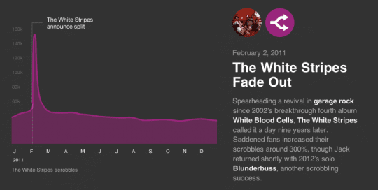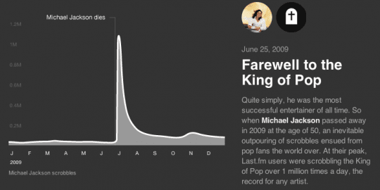 Opvallende spikes zijn er te herkennen als artiesten stoppen, band uitelkaar gaan of muzikanten overlijden. Zo zorgde de dood van Michael Jackson tot liefst 1 miljoen scrobbles van zijn werk op één dag!