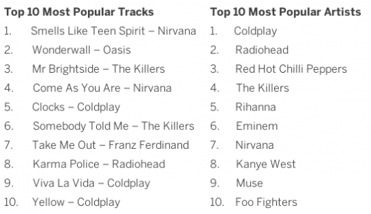 Sommige dingen had je misschien ook wel kunnen raden zonder 10 jaar bijhouden, zoals het feit dat Nirvana’s “Smells like teen spirit” het populairste nummer van de afgelopen jaren bleek te zijn. Al bleek Lil’ Wayne een stevige concurrent met zijn “Lollipop”, dat de meeste “likes” kreeg (en tegelijkertijd het vaakst geblocked werd).