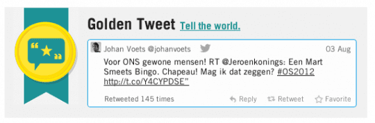Ruim voor de meute uit publiceerde sociaal platform Twitter vandaag het jaaroverzicht 2012. Het Amerikaanse bedrijf – veel gebruikt voorbeeld van “de (2 van de) 3 V’s van Big Data” – was ook dit jaar weer veelvuldig in het nieuws. Van revoluties tot gouden medailles. Maar ook je persoonlijke jaar is in te zien! Je kunt je eigen jaar in tweets terugkijken en eens grondig analyseren!