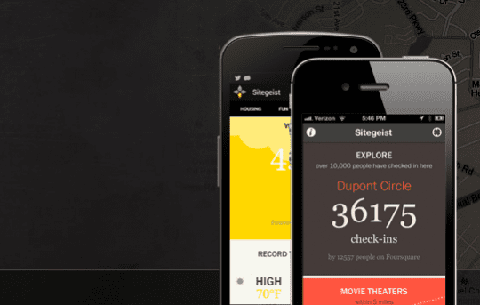 Sitegeist is een project van de Sunglight Foundation in samenwerking met IDEO. De mobiele applicatie maakt gebruik van GPS en de publiek beschikbare informatie over een gemeenschap, huizenmarkt en historie. Alles wordt direct opgehaald en weergegeven in strakke infographics.