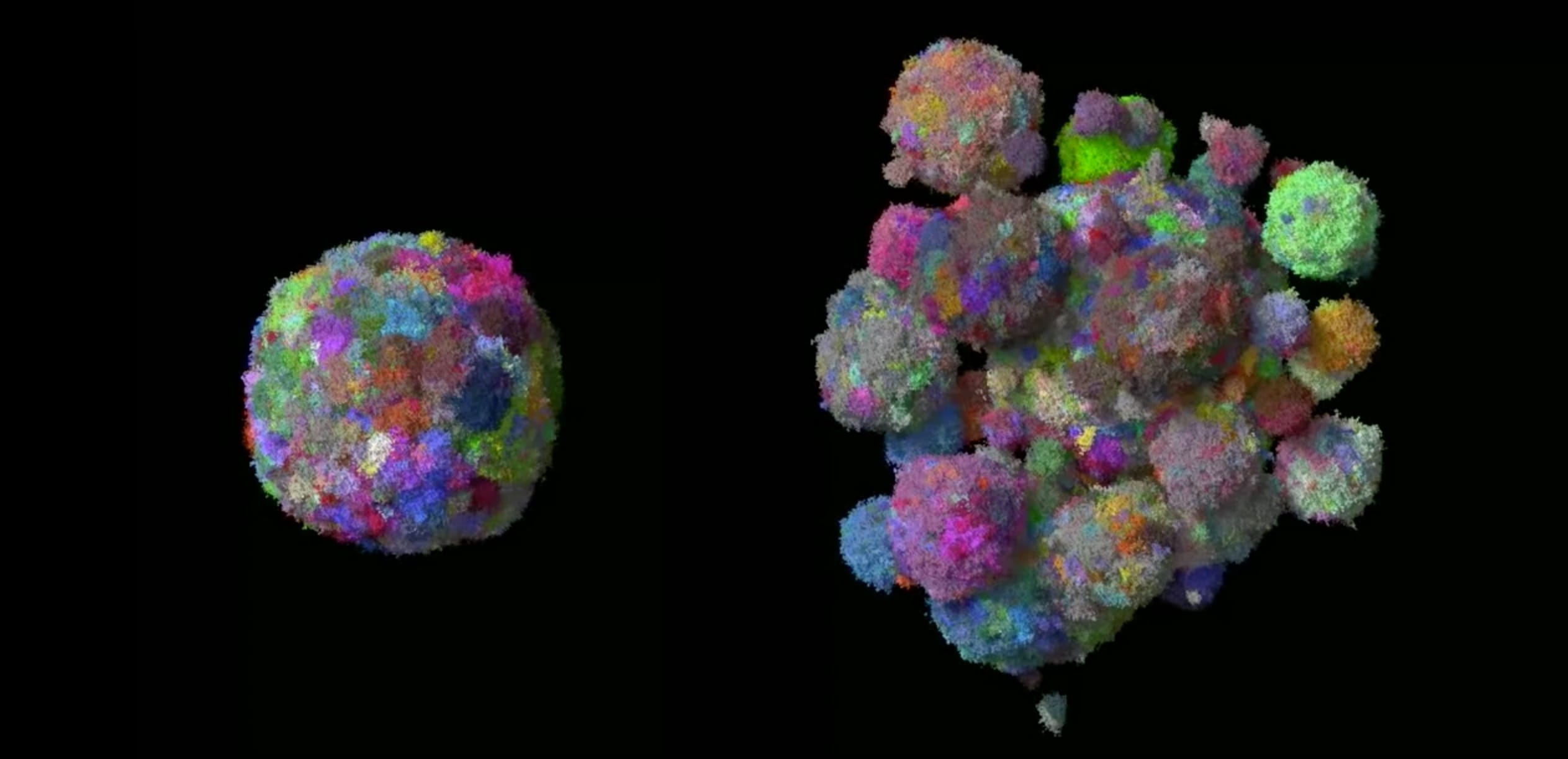 Elke gekleurde bol staat voor een aantal kwaadaardige cellen, die bij kankerpatiënten in een korte tijd de gezonde cellen ontgroeien. De techniek zorgt ervoor dat onderzoekers veel sneller kunnen zien hoe groot de tumor precies is. Bij eerdere simulaties was dit nog niet zo accuraat, waardoor de onderzoekers altijd rekening moesten houden met de kans op afwijkingen in de simulatie.
