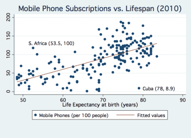 Soelberg is zich bewust van het feit dat ze een – tamelijk – brede aanname doet in haar stelling: “There are multiple factors that can influence an indicator as broad as life expectancy, such as a country’s GDP, access to health care, sanitation, etc. However, it is interesting that as cell phone usage grows, the change in life expectancy is positive.”