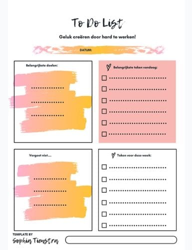 Niet alleen Mark Tigchelaar heeft een template beschikbaar gesteld, ook ondernemers Sophia Tienstra, Kae Sutherland en Ellis ten Heuvel hebben een speciaal to do-list template gemaakt waarmee zij het liefste werken. Deze kun jij zelf ook gebruiken om je prodcuctiviteit te verhogen.