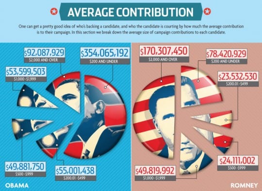 Zo heeft de Obama campagne $556.000.000 (iets meer dan een half miljard!) gebruikt. De uitdager Romney moest het doen met $339.800.000. Van alle wat kleinere donateurs (minder dan 200$ elk) krijgt Obama de overgrote meerderheid. Romney daarentegen krijgt de helft van zijn inkomsten uit donaties van 2000 $ of meer.