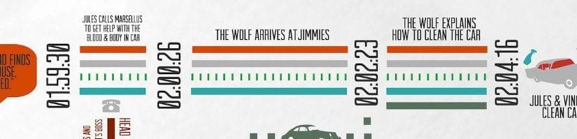 Soms heeft data visualisatie niet meer uitleg nodig dan de titel doet vermoeden. Designer Noah Smith maakte een fantastische chronologische infographic van de Tarantino-klassieker “Pulp Fiction”. In hi-res te downloaden of voor de echte fans te bestellen als poster. Goed om te de volgende keer als gids bij de hand te houden als je de DVD-speler weer eens aanslingert! Zie de site van Smith voor meer informatie.