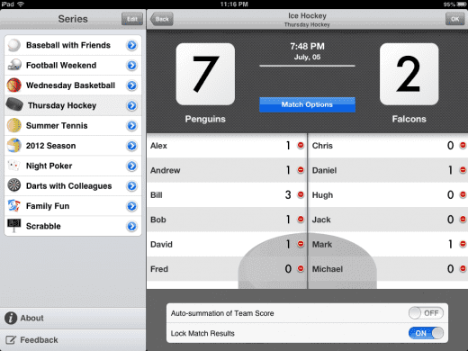 Wat de app echt tof maakt, is niet alleen dat elke sport zijn eigen vormgegeven scorebord heeft, maar dat er voor elke sport een berg statistieken per speler worden bijgehouden. Zo kun je niet alleen zien welk team een wedstrijd wist te winnen, maar ook wie er verantwoordelijk was voor de doelpunten of wie er de meeste service fouten maakte!