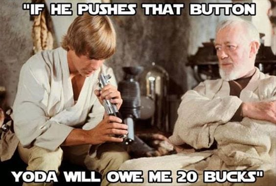 Zagen we Grogu nu echt proberen de Darksaber te pakken? Hoe dan ook, het had er alle schijn van dat de schrijvers in de slotscene nog een knipoog maakte naar de trouwe meme-volgers. Want met zijn “voor je het weet, prik je je oog uit”, lijkt Moff Gideon te hinten naar de foto van de set van A New Hope. Op die behind-the-scenes foto laat een jonge Luke Skywalker zien hoe je een lightsaber moet vasthouden. Of niet..