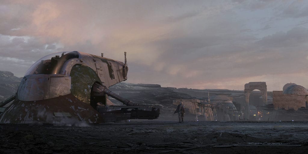 Voor het eerste zien in The Empire Strikes Back en na al die jaren in de vergetelheid terug in beeld: Slave I, het opvallende schip van Boba Fett. Waarschijnlijk heeft Fett hem goed weten te stallen op Tatooine in de jaren dat hij zelf ondergedoken zat op die zanderige planeet.