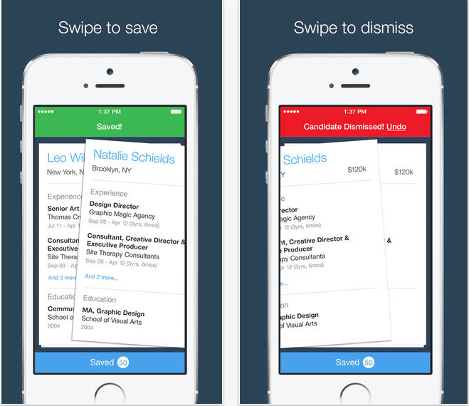 TheLadders Recruiter werd vorige week gelanceerd en is juist gericht op recruiters. Deze app laat recruiters eenvoudig kandidaten beoordelen terwijl ze onderweg zijn. Kandidaten worden aan de kant geschoven met een veeg naar links en bewaard met een veeg naar rechts. Anders dan Tinder heeft Recruiter wel een undo-functie voor het geval je een pareltje van een kandidaat per ongeluk afwijst.