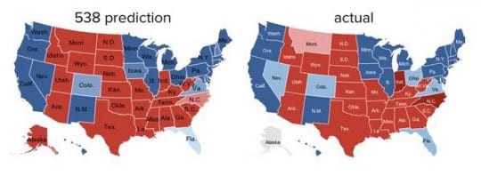 Normaliter zou je het wegcijferen als een gevalletje “Mooi Weer Spelen”, maar lezers van dit blog kennen de kracht van data en het is geen geheim dat data analyse centraal stonden tijdens deze verkiezingen. Maar mensen met een ijzersterk geheugen herinneren zich wellicht ook Nate Silver. Wie? Nate Silver, de Nostradamus van de Amerikaanse politiek. Data wetenschapper, koning van de statistiek en de persoon die in 2008 de uitslag correct voorspelde in 49 van 50 Amerikaanse staten. Die laatste ging mis op het laatste moment, toen Obama op 1% de overwinning uit zijn handen zag glippen.