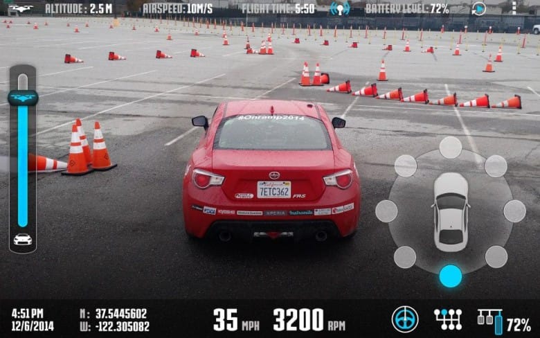 Although many follow-me applications are in development in the drone community, we wanted to build something that was more dynamic, with camera angles and controls that are capable of handling the acceleration and cornering capabilities of the Scion.