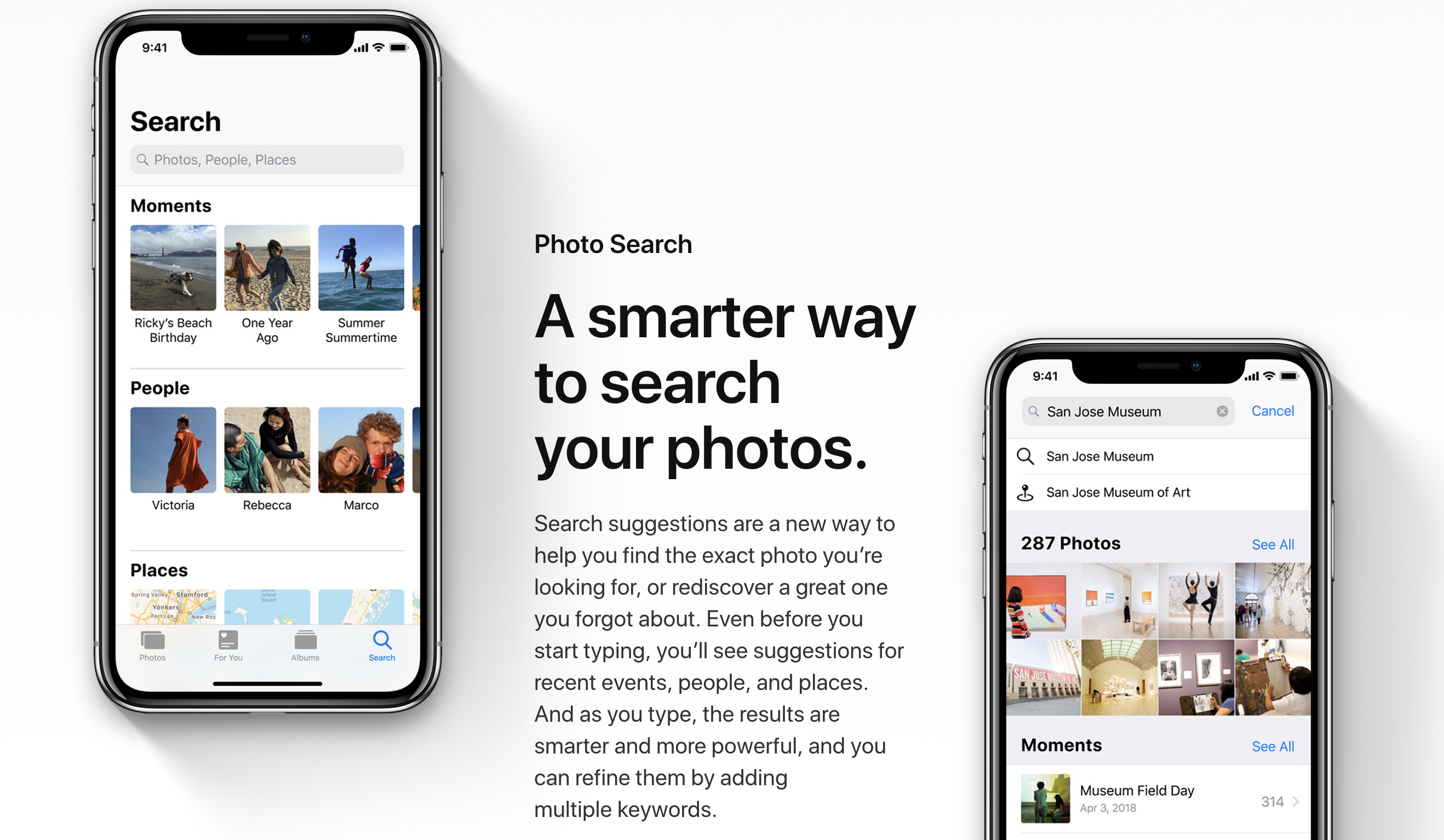 In de nieuwe fotoapp kun je straks makkelijker foto’s terugzoeken die gerelateerd zijn aan een bepaalde gelegenheid of locatie. Foto’s doet dat door onder meer zoeksuggesties te geven. Behalve locaties worden ook personen, objecten of categorieen geopperd door de app. Privacy van je foto’s staat nog steeds hoog in het vaandel, benadrukt Apple.